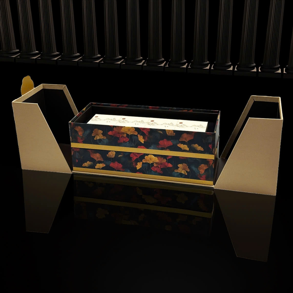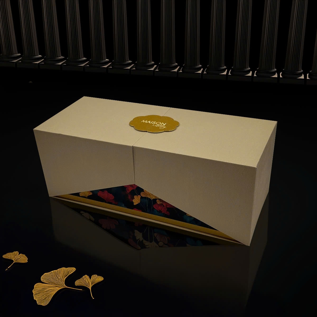 Bảo Diệp không chỉ là một hộp bánh mà còn là một tác phẩm nghệ thuật. Hộp được chế tác từ giấy mỹ thuật nhập khẩu cao cấp với đường gân nổi 3D độc đáo, tạo hiệu ứng thị giác và xúc giác tinh tế. Kiểu dáng mở hai bên như đôi cánh lan tỏa cùng họa tiết lá Ginkgo (Ngân Hạnh) in UV sắc nét bên trong, biểu tượng của sự trường tồn và trí tuệ, làm nổi bật thông điệp "bảo vật trong lá" – gìn giữ những điều quý giá. Thiết kế này khẳng định sự sang trọng và đẳng cấp của thương hiệu Maison Luxury trong từng chi tiết.