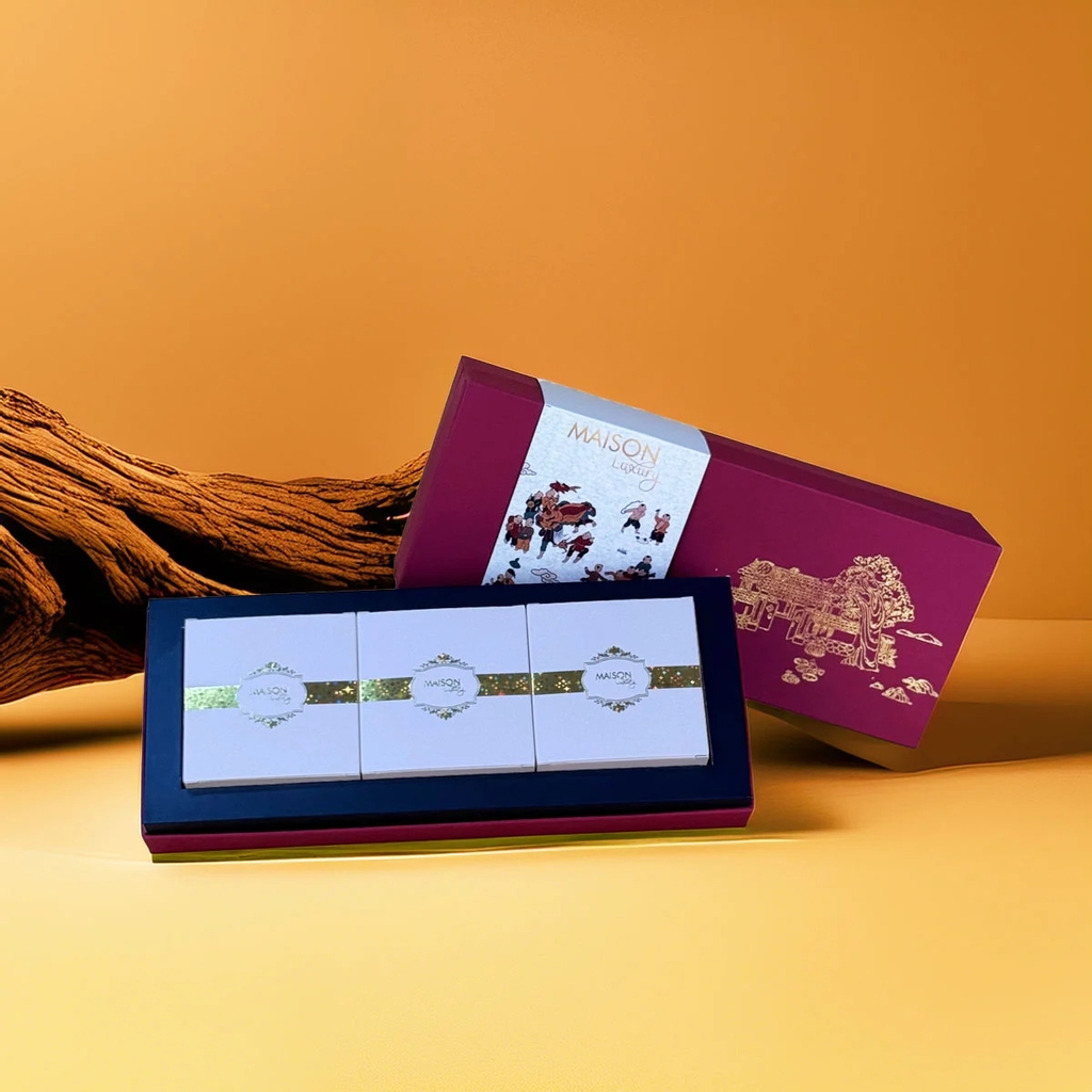 Hộp bánh trung thu Maison Luxury được chế tác từ những chất liệu cao cấp nhất. Toàn bộ hộp sử dụng giấy mỹ thuật nhập khẩu, có vân 3D nổi tự nhiên, tạo cảm giác sang trọng ngay từ lần chạm đầu tiên. Họa tiết trên hộp được gia công bằng kỹ thuật ép kim ánh vàng lấp lánh, tạo nên những điểm nhấn đắt giá, nâng tầm giá trị thẩm mỹ và sự tinh tế của món quà.