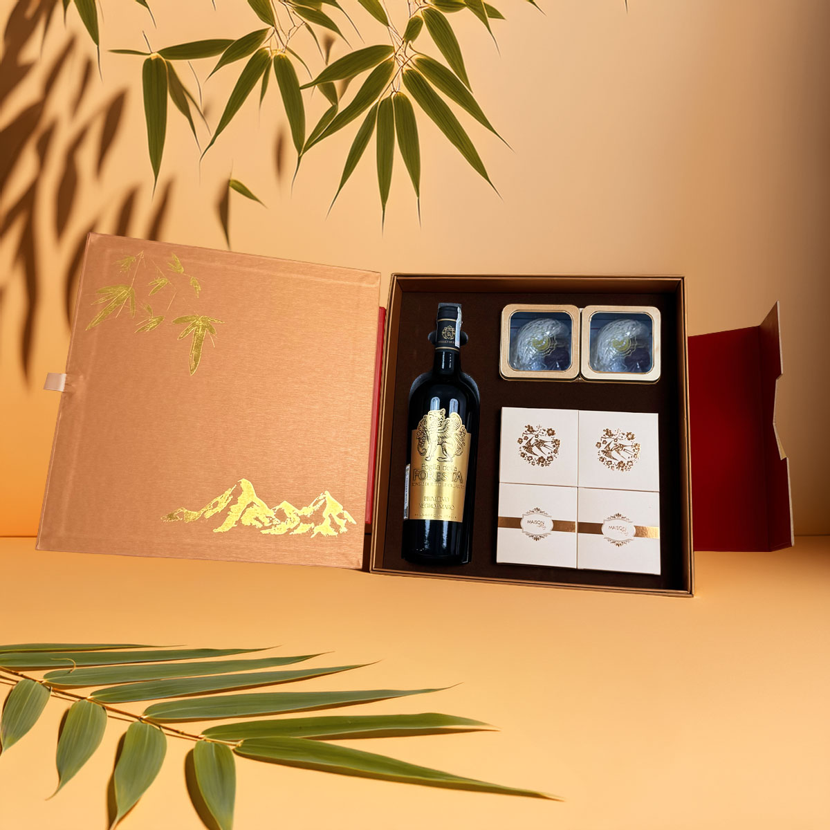 Tùy theo phiên bản, hộp quà có thể gồm vang nhập khẩu, bánh kẹo Maison, trà hoặc đặc sản Việt cao cấp – phối hợp tinh tế theo ngân sách và nhu cầu doanh nghiệp.