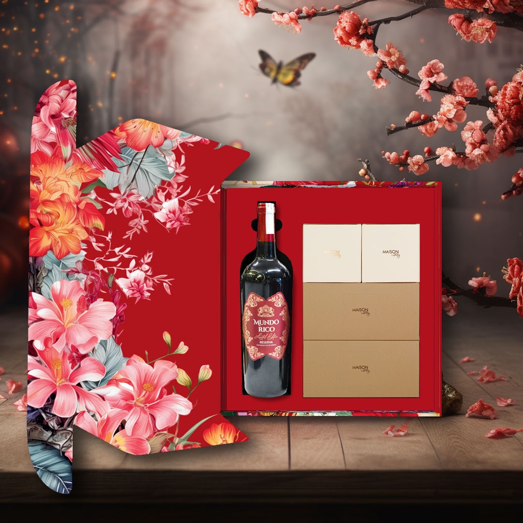 Hộp quà Tết "Mùa Xuân" từ Maison Luxury với thiết kế tươi sáng, họa tiết hoa lá và bướm phác họa sự rực rỡ của mùa xuân, trên nền màu đỏ tươi vui. Đây là sự lựa chọn tuyệt vời để tặng cho bạn bè, người thân và đối tác trong dịp Tết.