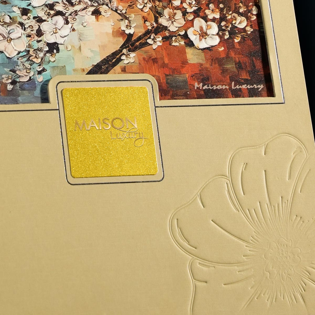 • Bề mặt giấy có vân hoa văn nổi, tạo chiều sâu thị giác tinh tế và cảm giác chạm sang trọng.