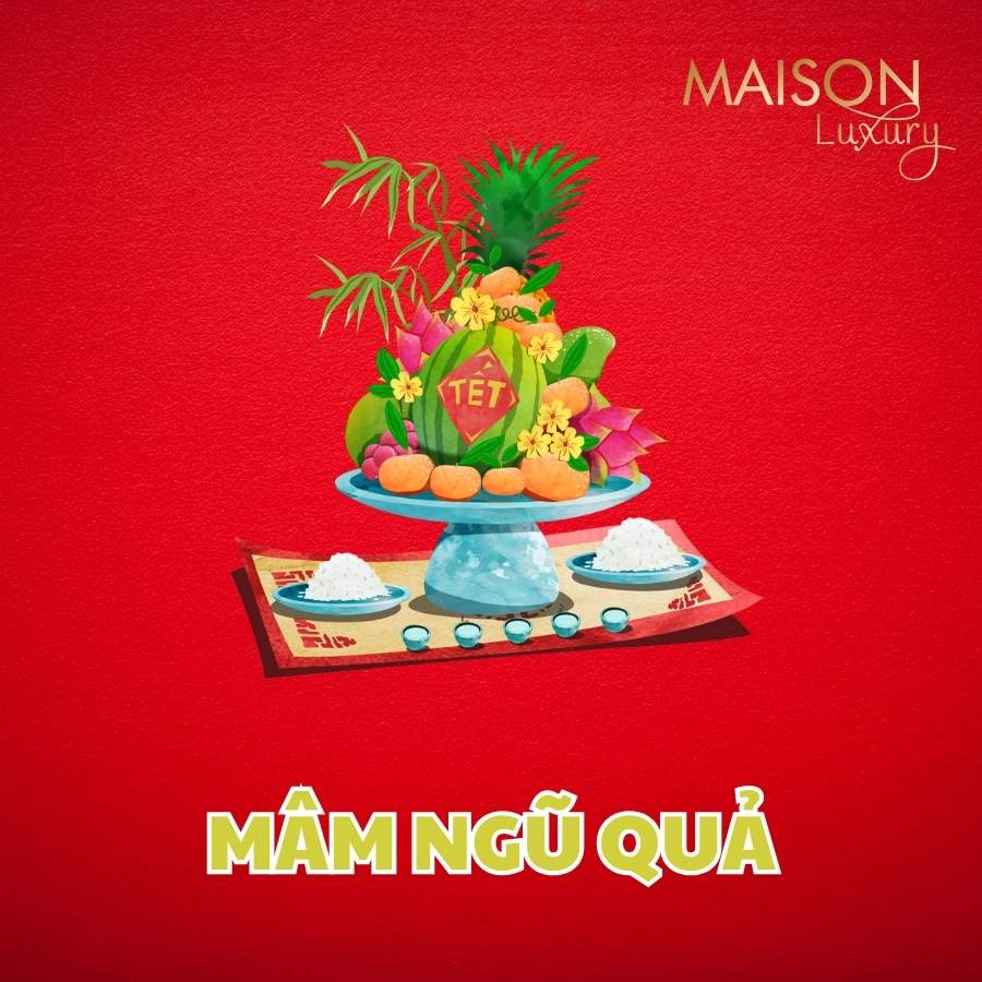 Mâm ngũ quả: Các gia đình thường chuẩn bị mâm ngũ quả với các loại trái cây đặc trưng để bày lên bàn thờ, cầu mong may mắn và tài lộc.